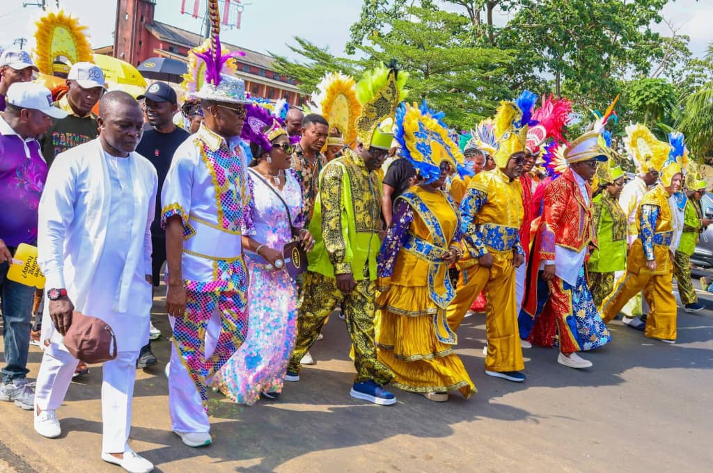 The 2025 Carnival Calabar took off on a grandiose and colorful note as Governor Otu, on Monday, December 29, flagged it off. Otu, who arrived with his wife, Eyoanwan Otu, paid tributes to his predecessors, namely, His Excelencies Mr Donald Duke, Senator Liyel Imoke, and Prof. Ben Ayade, for founding and ensuring the sustainability of Carnival Calabar during their different administrations.