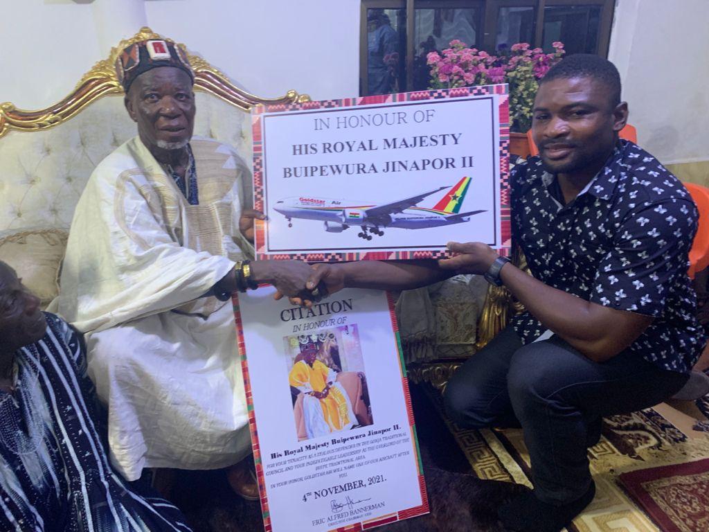 According to mobile.ghanaweb.com, the citation from Goldstar Air Wings of Ghana presented to the Buipewura on 4th November, 2021 at the his Palace reads; “His Royal Majesty Buipewura Jinapor II. For your tenacity as a zealous Defender in the Gonja Traditional Coukand your Indefatigable As The Overlord of the Buipe Traditional Area, In Your Honour Goldstar Air Will Name One of Our Aircrafts After You. 4th November, 2021.