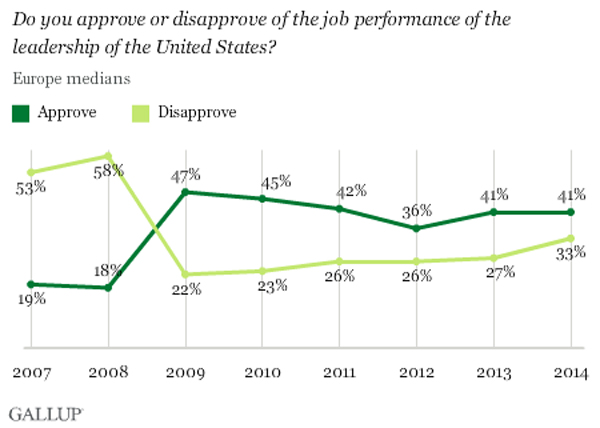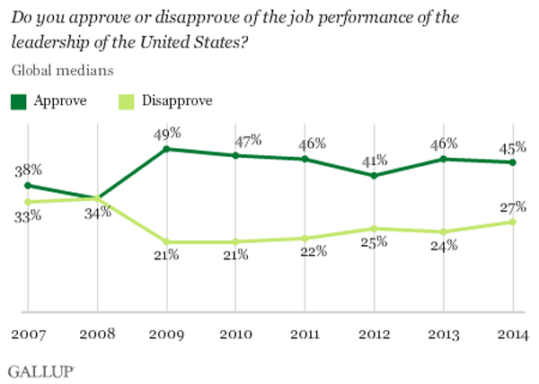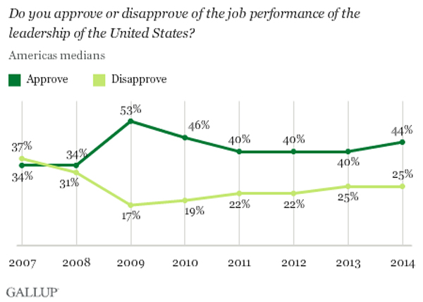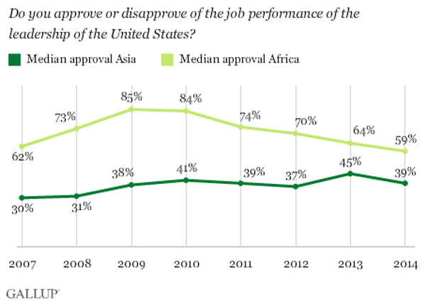 Despite losing some ground in Africa and Asia, the 45% median approval across the 135 countries and areas surveyed in 2014remained stable during yet another challenging year for U.S. foreign policy.