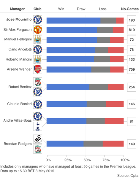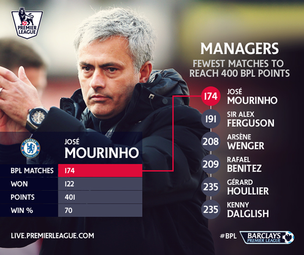 He has won 135 of 193 Premier League games in charge of the London club, which comes to a win percentage rate of 70%. Under Mourinho, Chelsea have lost fewer than one in 10 league games.