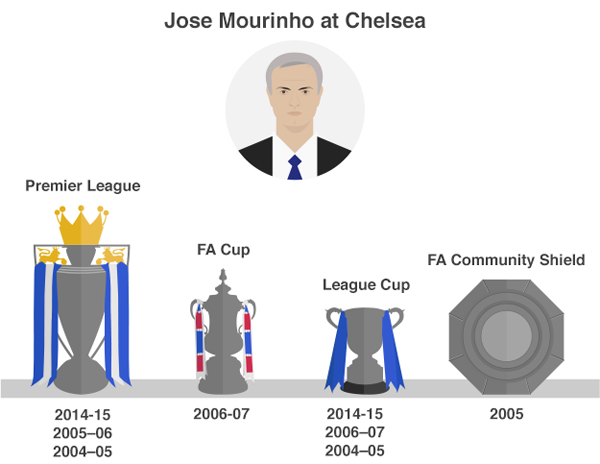 The Chelsea boss has won the league in four different countries, lifted the European Cup with two clubs, won a Uefa Cup, an FA Cup and three League Cups, as well as securing an array of domestic cups in Portugal, Italy and Spain.