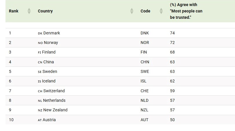 Denmark leads with 74% of respondents saying that most people can be trusted, followed closely by Norway (72%) and Finland (68%).