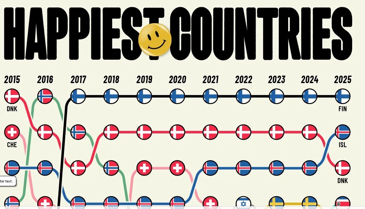 This chart tracks how the world’s happiest countries have moved up and down the rankings each year since 2015, based on survey data from over 140 countries compiled by Gallup and published in the 2026 World Happiness Report