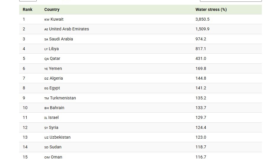 Kuwait leads by a wide margin, using the equivalent of 3,850% of its renewable water supply. The United Arab Emirates follows at 1,509.9%, highlighting a heavy reliance on desalination and non-renewable groundwater.