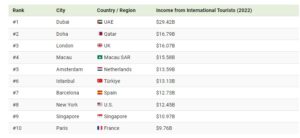 Middles East, city Dubai has been ranked as the leading destination where international travelers spend the most as it records $29.42B in 2022.