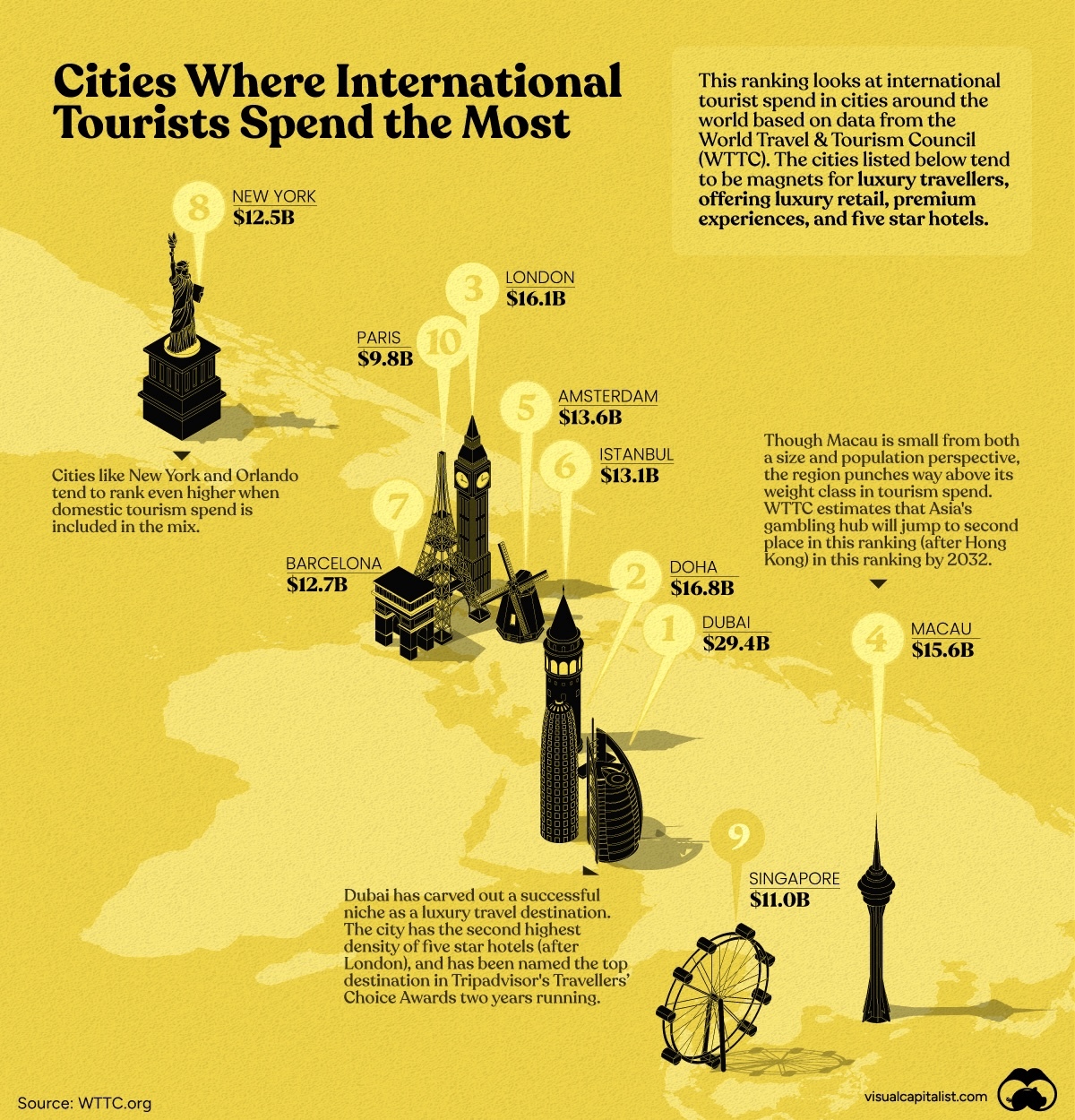 According to visualcapitalist.com, when it comes to travel, some tourists spare no expense. And some cities are well suited to attract them.
