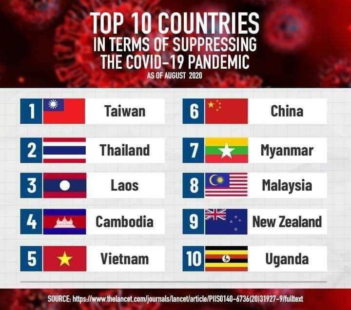 The top 10 countries according to Lancet are; Taiwan, Thailand, Vietnam, Lao People’s Democratic Republic, Cambodia, China, Myanmar, Malaysia, New Zealand and Uganda.